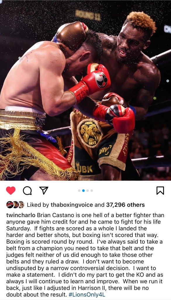 Jermell Charlo unified super welterweight champion earned a split decision draw this past saturday vs Wbo Champ Brian Castano for undisputed supremacy which the result has been the primary boxing conversation till this day (wilder voice) Many fans was torn in disagreement on who actually won the fight. Charlo responded on his recent ig post on the aftermath of his bout and what he looks forward too and basically his response to how a true champion takes accountability of his performance.