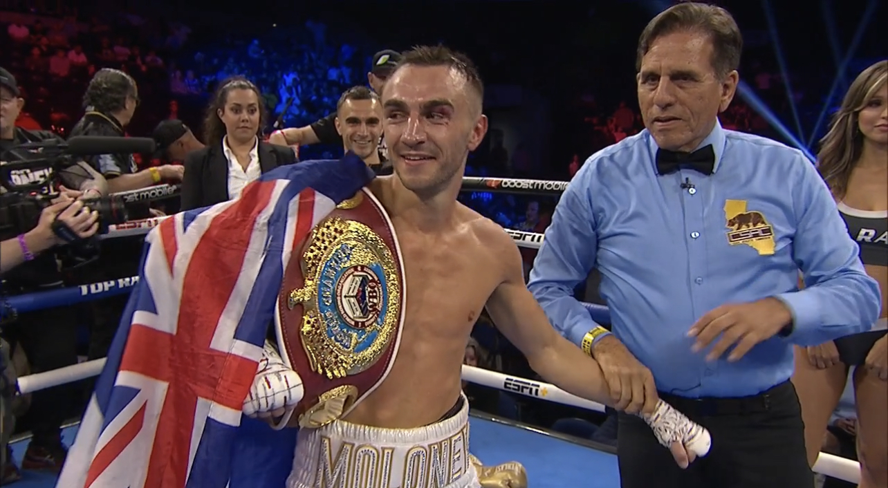 Jason “Mayhem” Moloney (26-2, 19 KOs) Defeats Filipino contender Vincent Astrolabio (18-4, 13 KOs) for the vacant WBO bantamweight world title in a Majority decision with judges scoring it 114-114, 115-113, 116-112 Moloney, a two-time world title challenger, has won five straight bouts since challenging pound-for-pound great Naoya Inoue.