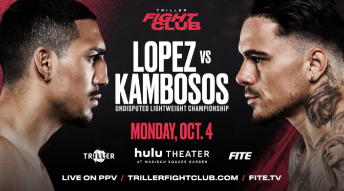 TRILLER FIGHT CLUB has announced ‘THE TAKEOVER’ TEOFIMO LOPEZ, (16-0, 12 KOs), fighting out of Brooklyn, NY, will defend his UNDISPUTED Lightweight World Titles, (WBC, WBA, WBO, IBF) in the highly anticipated 12-round battle against Mandatory Challenger ‘FEROCIOUS’ GEORGE KAMBOSOS JR., (19-0, 10 KOs) of Sydney, Australia on Monday,October 4 in the Hulu Theater atContinue reading “Teofimo Lopez lineal UNDISPUTED lightweight King keeps the legacy going as another NYC great TAKING OVER its Sport.”